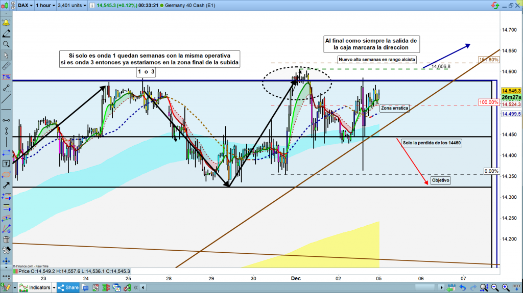 En el gráfico de 1 hora del dax40, podemos ver, con más detalle, el escenario operable. La apertura semanal ha sido en, 14549, de momento en la parte alta de la caja. La clave por arriba, los 14606, un nuevo alto, confirmaría estructura alcista, y seguiríamos bastantes semanas, posiblemente hasta final de año o la primera semana del 2023, en una operativa muy parecida a la de las últimas 3 semanas, en rango alcista subiendo periódicamente de nivel, para ir generando nuevos compradores, pero sin dejar progresar el movimiento alcista.