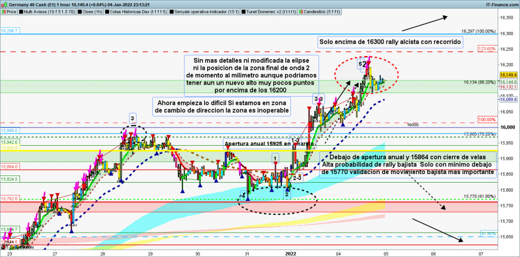 Para hoy la situación mucho más compleja. Según mi conteo, estamos ya en zona de finalización o de posible cambio de dirección. Como tantas veces, la pregunta de siempre, el movimiento ha finalizado en 16202, o aún le queda un último máximo entre los 16202 y un espacio superior, pero por debajo de los 16298. Lo de siempre pese a testear casi milimetricamente el objetivo previsto, y mirando la estructura parece que ha finalizado, podemos tener un nuevo movimiento para un nuevo alto antes de caer, o no. Esto significa que si los inversores dudan también, el precio puede entrar en movimientos erráticos de poco recorrido. La verdad es que la zona de indefinicion es bastante importante. Veámosla con más detalle.
