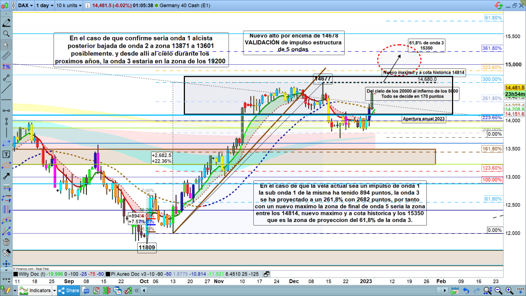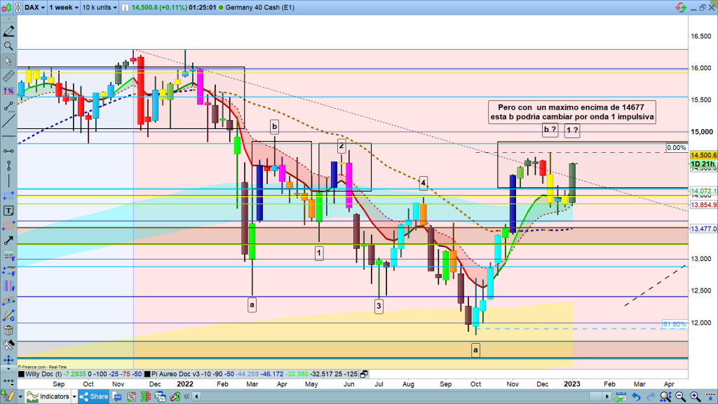 En gráfico semanal del dax40, podemos ver como la fuerza de esta semana nos ha llevado de momento hasta la zona de los 14500. Un nuevo alto por encima de los 14677, nos dejaría una estructura, con claras líneas de impulso alcista. Lo que cambiaria completamente el escenario planteado.