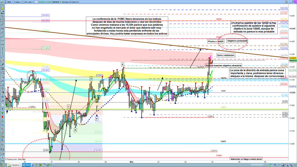 Para hoy, en el dax, la situación parece más clara. Ayer todo y moverse durante todo el día, dejando margen, el testeo a los 14100 a 14150, eran de alta probabilidad. Con el impulso de la volatilidad, paso de 14191, con lo que automáticamente el próximo objetivo es la directriz, si llega con fuerza o alta volatilidad hoy a las 9 h con la apertura de Frankfurt, muy posible testeo a la cota 14420. Si os fijáis, todo y la volatilidad del momento no ha cambiado nada, estamos hablando de momento, exactamente de los mismos movimientos y objetivos que ya teníamos marcados ayer.