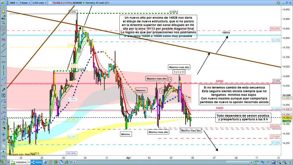 Técnicamente, nuevo alto y, por tanto, validación alcista, sin embargo, el precio no paro sobre los 14560 o la zona de corrección de H1, que era lo que esperaba, sino que siguió de nuevo hasta los 14420. Incluso por debajo de la cota, de nuevo a cinta amarilla, pero sin marcar nuevo mínimo más bajo que el mínimo anterior.