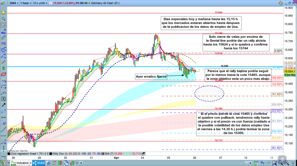 Si el precio, cerrara velas de este gráfico de 1 hora, por encima de la Genial line, ahora a inicios de asiática, está en la zona de los, 15572, pero tened en cuenta que es una zona dinámica que se va moviendo poco, pero moviendo cada hora. Por tanto, si se da la situación, a la que el precio se coloque claramente con confirmación de quiebre de la Genial line, la dirección ya sería alcista con primer objetivo los 15624, si llega hasta esta zona, solo si la quiebra y confirma el quiebre seguiríamos en dirección a los 15744. Muchísima suerte, muy buenos trades, y pasad una muy buena semana santa, cargad las pilas que la semana que viene, a partir del martes seguro que tendremos movimientos importantes.