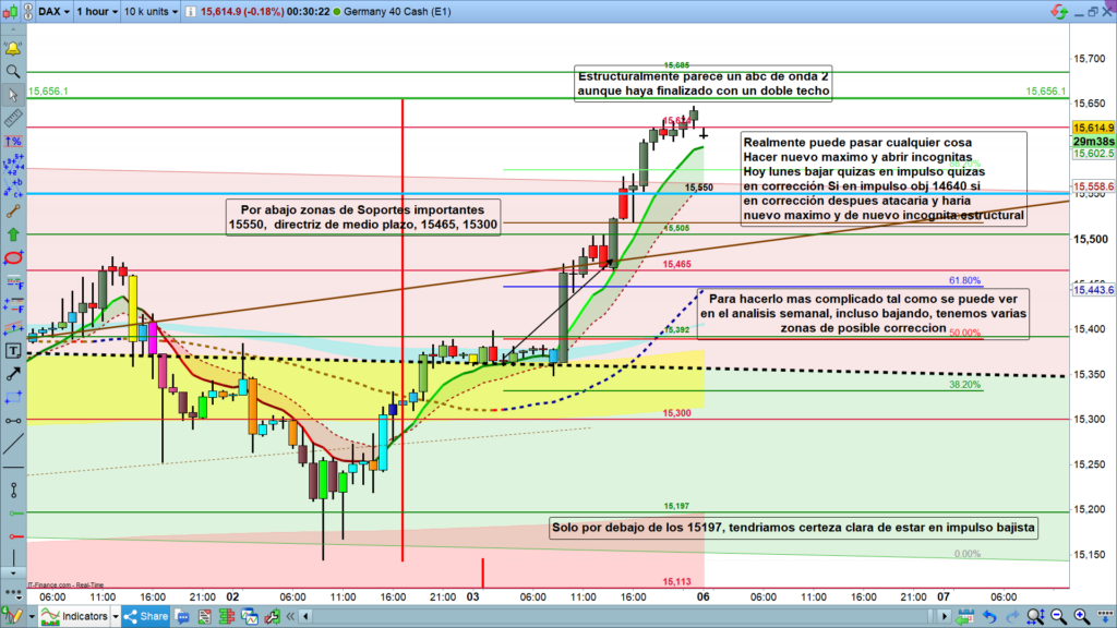 Por la parte inferior, que parece a estas horas el camino más lógico, tenemos como soportes a tener en cuenta la cota 15550, histórica importante, la directriz de medio plazo, la cota 15465 y la cota 15300. No creo que el día de hoy, en principio, de muchos más recorridos que los que pudiera tener dentro de estas zonas. Muchísima suerte y muy buenos trades.