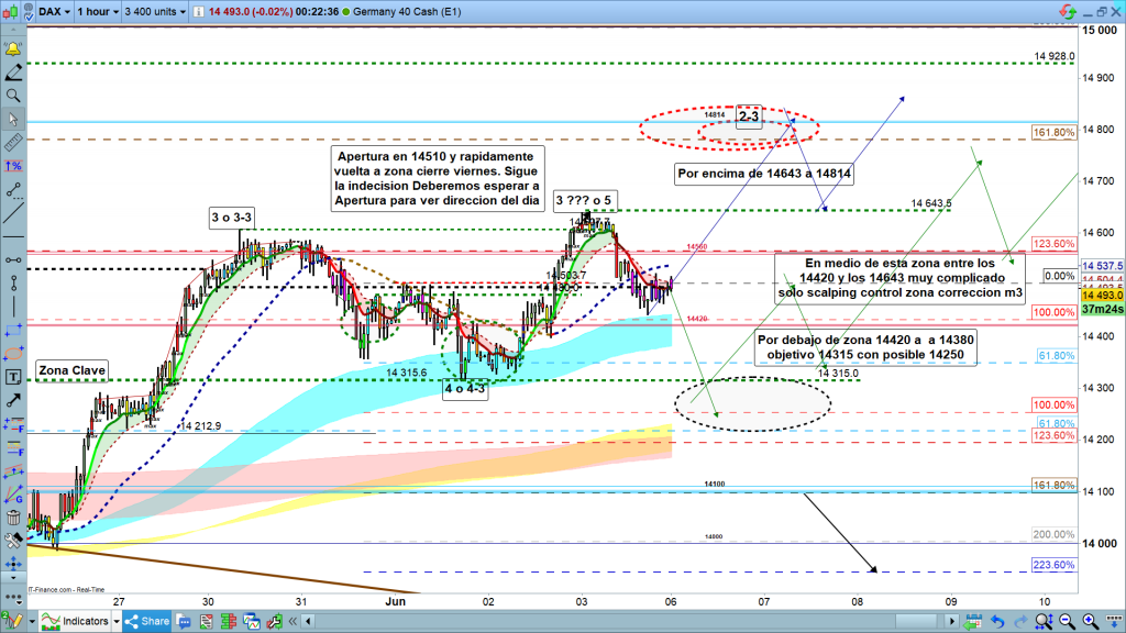 En gráfico de 1 hora y después de apertura semanal, el precio sigue en indecisión. Apertura semanal en 14510, y rápidamente vuelta a zona de cierre de viernes pasado. Después de la primera hora de apertura, de momento no enseña camino, lo más probable es que después de sesión asiática, en preapertura a las 8 h, y sobre todo en apertura de Frankfurt a las 9 h, tengamos indicaciones más claras de la zona más probable a atacar.