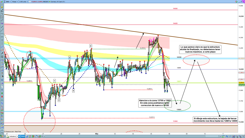 Para hoy, viernes y primer viernes de mes, con los datos de empleo Usa, podríamos tener de nuevo alta volatilidad. Mucha atención y prudencia a las 14,30 h, CET. La estructura más probable es, continuar hasta la zona 13700 a 13601, posible rebote en corrección alcista hasta la zona 14100, de nuevo. A partir de aquí, si dibuja esta estructura, lo más probable es que tengamos una serie de ondas 3 y 3 extendidas, bajistas, con sus correspondientes correcciones, para finalizar la onda 3 en la zona de los 12600 a 12411, corrección y nueva bajada. Aunque no creo que tengamos todos estos movimientos en el día de hoy. Al ser hoy viernes, aprovecharé el fin de semana, para estudio de estructuras más completo. Muchísima suerte y muy buenos trades.
