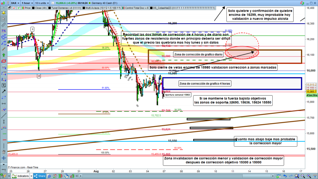Por la parte inferior, en principio la que parece más probable de desarrollo, viendo la misma tónica que la semana pasada, mientras el precio se mantenga por debajo de la zona de corrección de H1, deberemos esperar el movimiento bajista. Por debajo de la zona donde está el precio, justo por debajo de la cota histórica, 15864, tenemos la siguiente cota histórica diaria en la zona de los,15744, a partir de aquí ya empiezan los obstáculos importantes, en la zona entre los,15700 y los,15680, dependiendo de la hora en que ataque esta zona tenemos la directriz de medio plazo que tanto protagonismo está teniendo estos últimos meses. Si consigue quebrar la zona de la directriz siguiente soporte será la cuota histórica en los,15624, aquí sí que un posible quiebre de esta cota histórica, que de entrada parece complicado, nos llevaría directamente a la cota histórica importante que tanto protagonismo está teniendo este año en los, 15550. Esta zona se puede alcanzar incluso con una pluma de gráfico mediano o mayor, y rebotar ya en estructura correctiva.