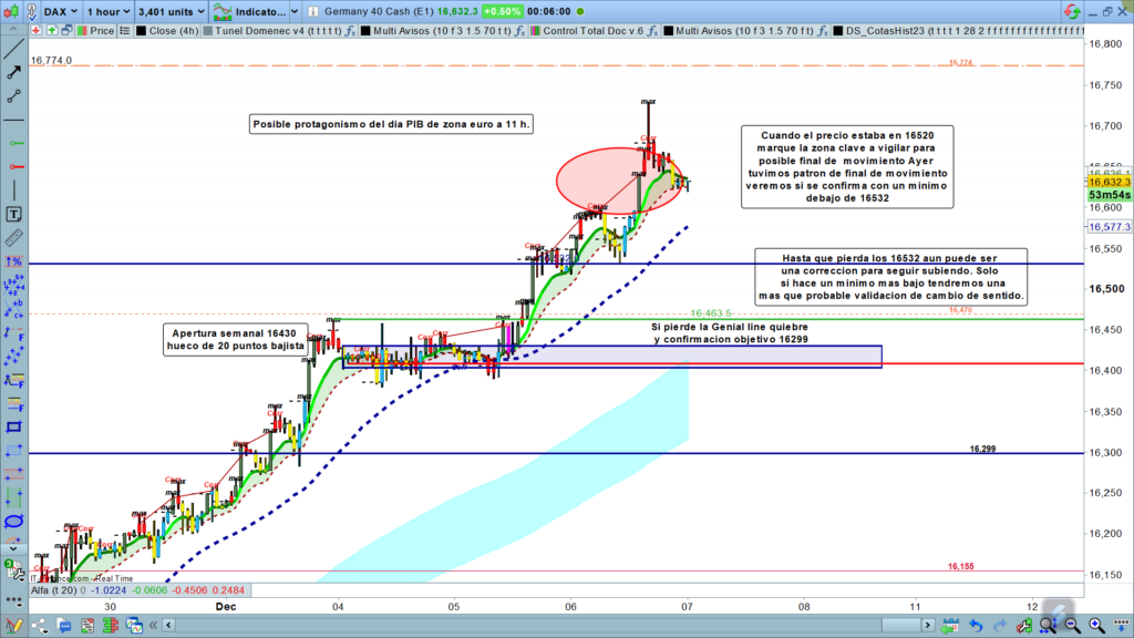 La zona clave será la zona de corrección de H1, donde ha empezado el nuevo día en la zona de los, 16620. si tenemos un rebote en la zona, quedará abierta la posibilidad de un nuevo ataque a nuevo máximo histórico, posiblemente en la zona de los, 16774.