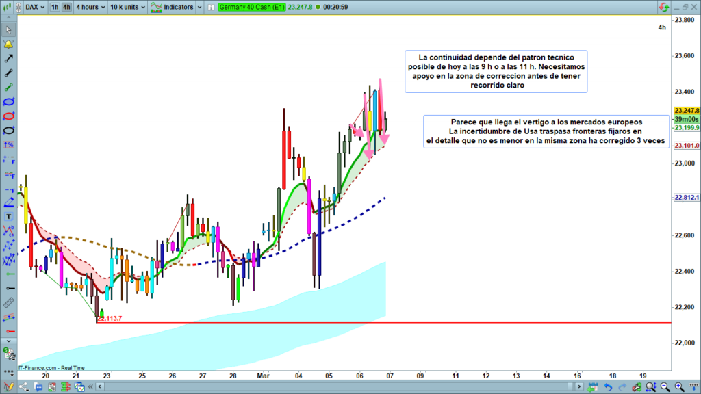 El DAX se encuentra en una zona de alta volatilidad, reflejando la incertidumbre en los mercados europeos. El gráfico muestra que el precio ha corregido tres veces en la misma zona, lo que indica un nivel de resistencia fuerte. Además, la continuidad del movimiento alcista dependerá del patrón técnico entre las 9:00 h y las 11:00 h CET, con la necesidad de confirmar apoyo en la zona de corrección antes de que el precio tenga un recorrido claro.