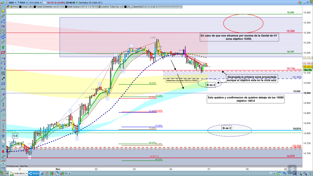 El objetivo esperado, la zona de la cinta azul de H1, en estos momentos a punto de empezar sesión asiática, dicha cinta está en la zona de los, 15057, es posible que mañana en la preapertura o en la apertura del parquet de Frankfurt, dicha cinta se encuentre un poco más arriba. Posiblemente coincidiendo con el final de la zona de proyección, en la zona de los,15070. Zona clave importante, la zona entre los 15070 y los, 15000.