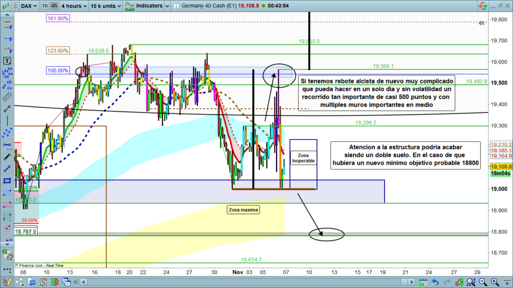 Ayer, totalmente según lo esperado, alta volatilidad, movimientos erráticos importantes con plumas y recorridos hacia ambos lados. La volatilidad, empezó ya con el inicio del día al publicarse los datos de los primeros estados en el recuento de las elecciones presidenciales de USA . Apertura del día en la zona de los, 19291, movimientos espectaculares de volatilidad, además varios de ellos con direcciones sin ningún tipo de lógica, la pluma más alta en la zona de los, 19566, para luego acabar cerrando el día en la zona de los, 19125, después de haber bajado hasta los, 19004.