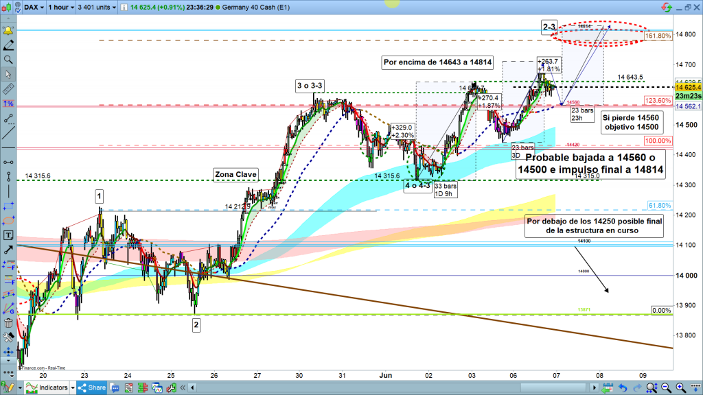 Para hoy, el objetivo más probable sería, seguir la corrección hasta la cota histórica de los, 14560, con posible pluma o movimiento rápido hasta los 14500. En principio, desde estas zonas, una o la otra, impulso hasta la zona desde los 14770, hasta los, 14814. Cuidado habló de zona, porque dependerá mucho del final de la corrección. Nos encontramos en una situación de onda 1 con recorrido de 329 puntos, mientras que la teórica onda 3, si ha finalizado, lo ha hecho solo con 270 puntos. Como la onda 3, según norma, nunca puede ser la más pequeña, una vez determinado el final de la actual corrección, el último impulso deberá ser menor a los 270 puntos.