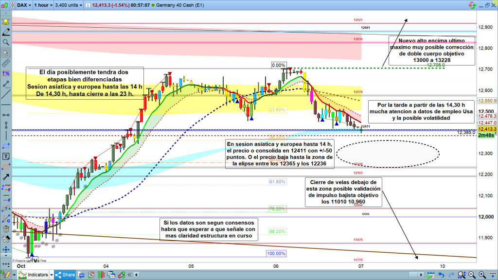 Durante la primera etapa, puede quedarse el precio consolidando en la cota 12411 con +/- 50 o 60 puntos arriba y abajo. En principio, lo más probable debería ser, continuar el rally bajista hasta la zona de los, 12365 y los, 12236, entre el 38,2% y el 50% del impulso entre los, 11809 y los, 12704, y en esta zona esperar los datos de las 14,30 h.