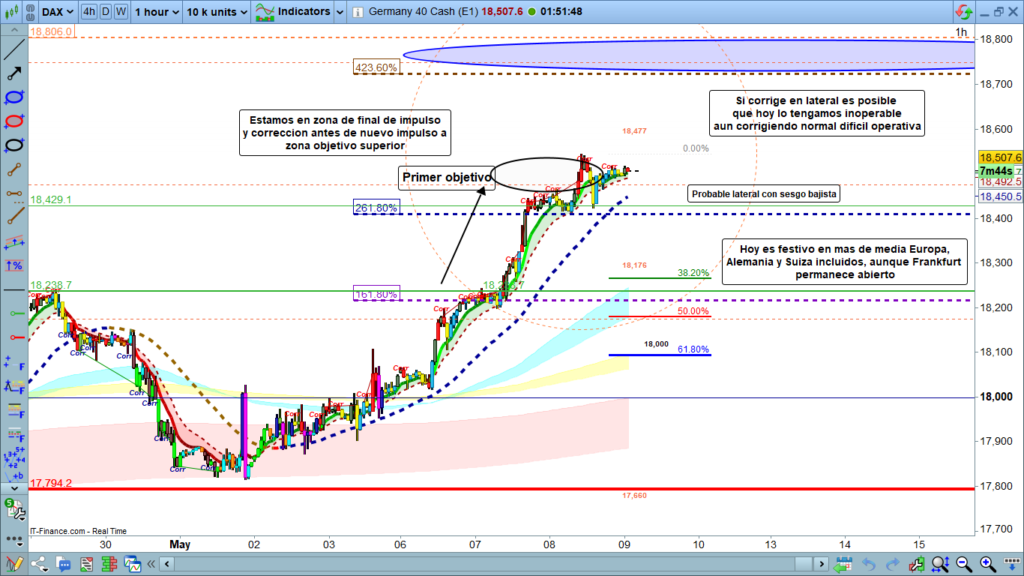 Alcanzada la zona esperada a nivel de proyección, lo normal es que ahora tengamos una situación de corrección, que vista de momento la fuerza del precio es muy probable que sea en forma de lateral con un ligero sesgo bajista. Si esto fuera así, muy probablemente la corrección no finalizaría hasta mañana viernes. Esta posibilidad parece lógica, teniendo en cuenta que hoy es día festivo en más de media Europa, aunque el parquet de Frankfurt permanecerá abierto, no así las diferentes bolsas de los países donde es festivo.