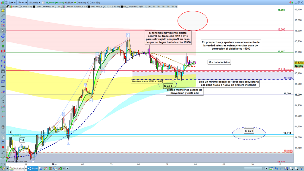 Si durante asiática o en preapertura y apertura de sesión Europea, el precio perdiera la zona de corrección, atención porque un mínimo por debajo del mínimo de ayer en la zona de los, 15066, nos proyectaría hasta la zona entre los, 14950 a 14850. En primera instancia, o sea en un primer movimiento, aunque para ello antes debería tener suficiente fuerza para quebrar las zonas importantes de soporte que ayer no pudo, zona de corrección de gráfico diario, zona de Genial line de gráfico de cuatro horas, cinta azul de gráfico de una hora y la cota psicológica en los 15000.