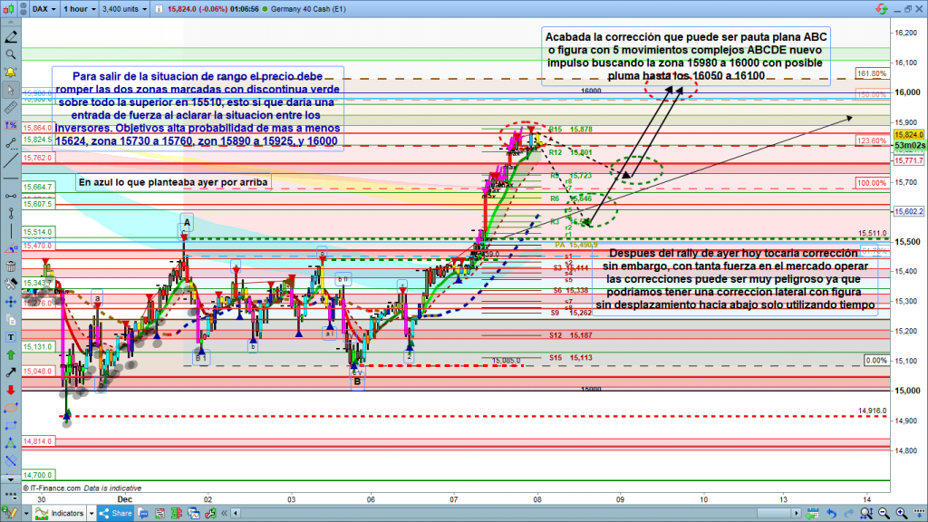 Para hoy, la situación cambia, si miramos la proyección después del mínimo en 15085, el pasado viernes, después de onda 1, onda 2, hemos tenido un impulso u onda del 300% de aquel primer movimiento. aparte de lo que pueda ocurrir en asiática, es posible testeo a la zona en 15890, o viendo la hora, quizás ya ni eso y corrección de este último impulso. La zona objetivo de esta corrección, debería ser la zona entre los 15664 y los 15550, con eje la cota histórica 15624, si cumple con los porcentuales normales de corrección.