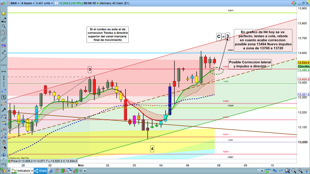 En gráfico de 4 horas del dax40, vemos el escenario actual, después de testeo en 13601, y pequeño rebote, para quedar corrigiendo entre los 13601 y los 13494, atención a zona de corrección de 4 horas, que la parte superior está ya en 13494. Lo más posible es que finalice la corrección y nuevo impulso hacia los 13601 y nuevo alto en cuanto pueda quebrar los 13601, hasta la zona si se produce hoy en 13700, a 13720. se mantiene fuerza alcista de momento ahora en inicio de sesión asiática.
