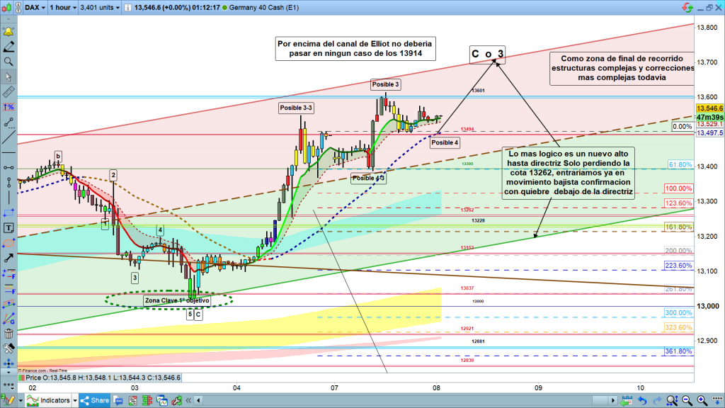 El movimiento más probable es un último impulso hasta la zona de la directriz, durante esta mañana, pasaría por la zona de los, 13700, a 13720, y en esta zona, rebote y final de onda.
