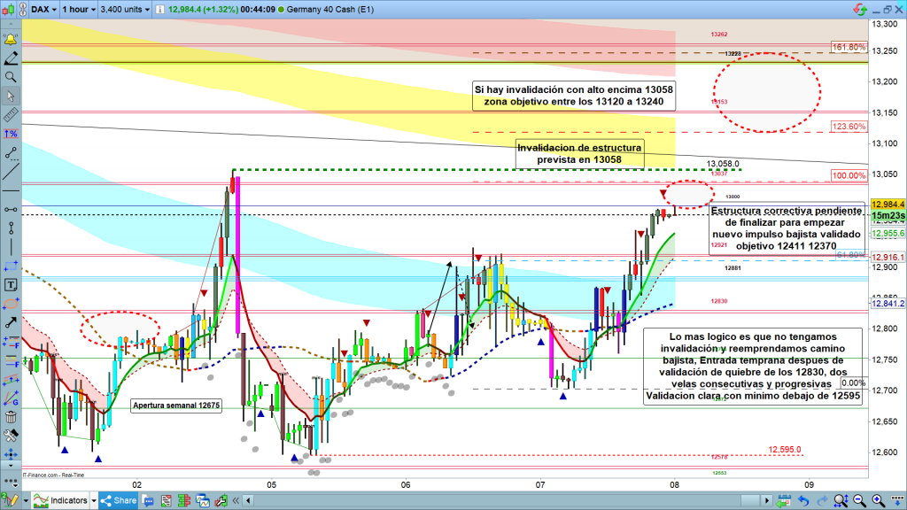 En el caso de tener invalidación, con un nuevo máximo por encima de los, 13058, estaríamos ya sin dudas en estructura de corrección de doble cuerpo y el objetivo final de esta nueva estructura, lo tendríamos entre los 13120 y los 13240.