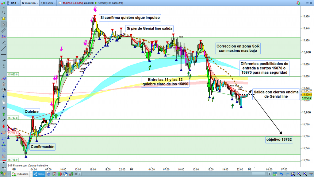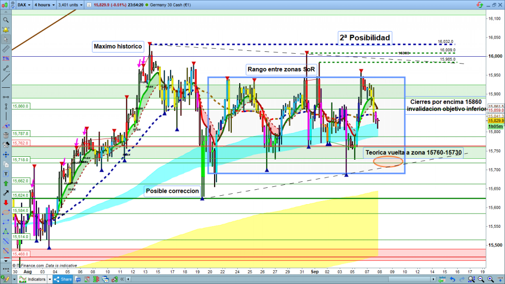 En el análisis flash de ayer, planteaba dos posibilidades. Al final la posibilidad más conservadora, la de mantenerse de momento en rango, ya por cuarta semana consecutiva, ha sido la operativa para el día de hoy. En principio como vemos en el gráfico de 4 horas, estamos ya en zona de 1ª cinta túnel Domènec, por tanto teniendo la sesión asiática de por medio, mucha atención a la pre apertura y apertura del mercado de Frankfurt, con la volatilidad podríamos tener movimiento rápido hasta 15762 o incluso hasta 15710, y rápido rebote de nuevo hacia arriba. Por otro lado con cierres de velas importantes H4 por encima de 15860, invalidaría el escenario planteado y podríamos tener nuevo ataque alcista, en esta ocasión si con más garantías de continuidad. Solo con mínimos o cierre de velas por debajo de 15710, deberemos estar muy atentos a la zona 15690, ya que un nuevo mínimo nos daría rally bajista por secuencia de máximos y mínimos más bajos, hasta los 15624, y muy probablemente hasta los 15470.