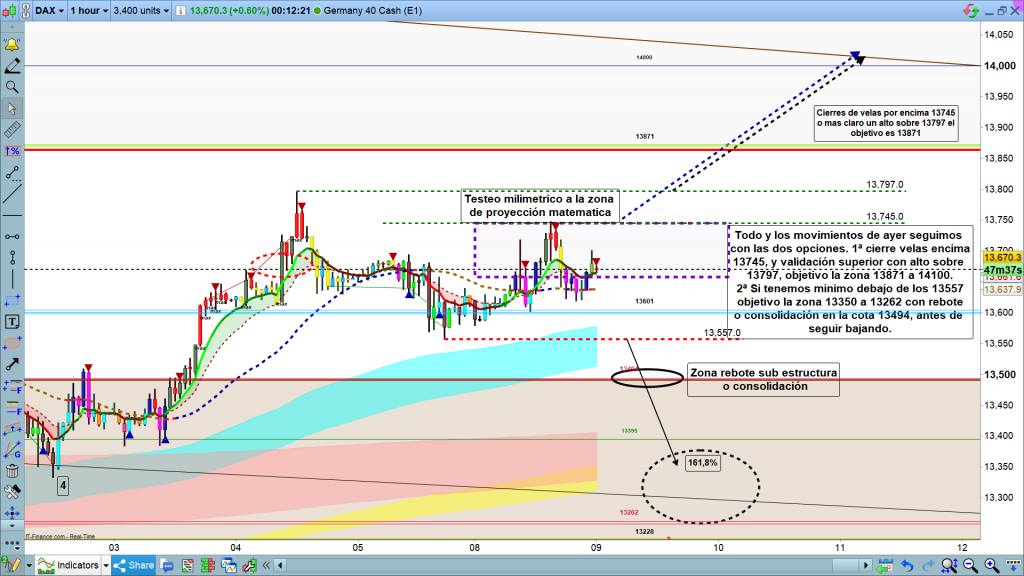 Ayer empezó el día consolidando en torno a la cota 13601. fue subiendo, hasta la apertura americana a las 15,30 h, que testeo la zona de proyección matemática en los, 13745, zona que si tenemos cierre de velas por encima seria validación primaria de movimiento a zona objetivo 13871 a 14100. Después del testeo casi milimetrico, de nuevo en bajada, para ir a cerrar el día, con el inicio de la nueva sesión asiática en la zona de los 13666.