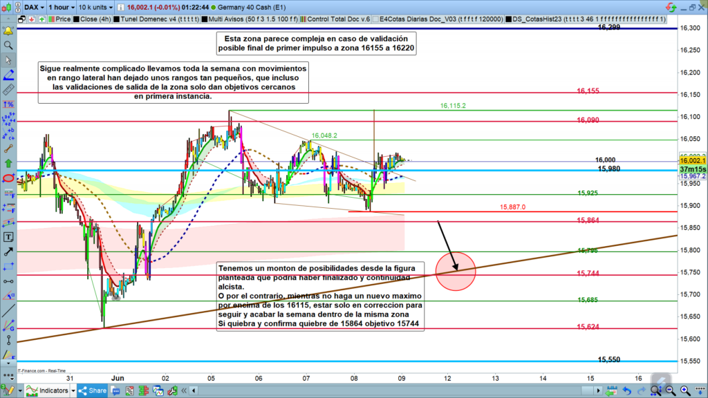 Estas son, técnicamente, las tres posibilidades. Sin embargo, aplicando el sentido común, no tenemos ninguna validación clara, independientemente de la cota 15864, que nos garantice mínimamente alguno de estos recorridos. Lo más sensato, en este tipo de situaciones, si no vemos una importante entrada de fuerza y que las velas se separan de forma importante de la zona de corrección, aunque sea en gráficos pequeños, repito lo más sensato siendo viernes es no operar. Muchísima suerte, y muy buenos trades, pasad y disfrutar del fin de semana, la semana que viene sin ninguna duda, será muy diferente a esta semana que acaba hoy, ya que hay importantes y múltiples datos macro de los que sí mueven el mercado.