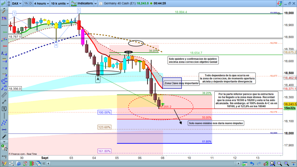El patrón de cinta, debería mandar el precio de nuevo hasta la zona de corrección, convirtiéndose la zona que hemos marcado en los 18370, en zona clave importante para el corto plazo. Realmente, todo dependerá de lo que ocurra cuando el precio alcance la zona de corrección de gráfico de cuatro horas, tanto si lo hace ahora directamente después de apertura semanal al haber finalizado patrón de cinta, como si aún hiciera un nuevo mínimo dejando una pluma y volviendo después a zona de corrección.