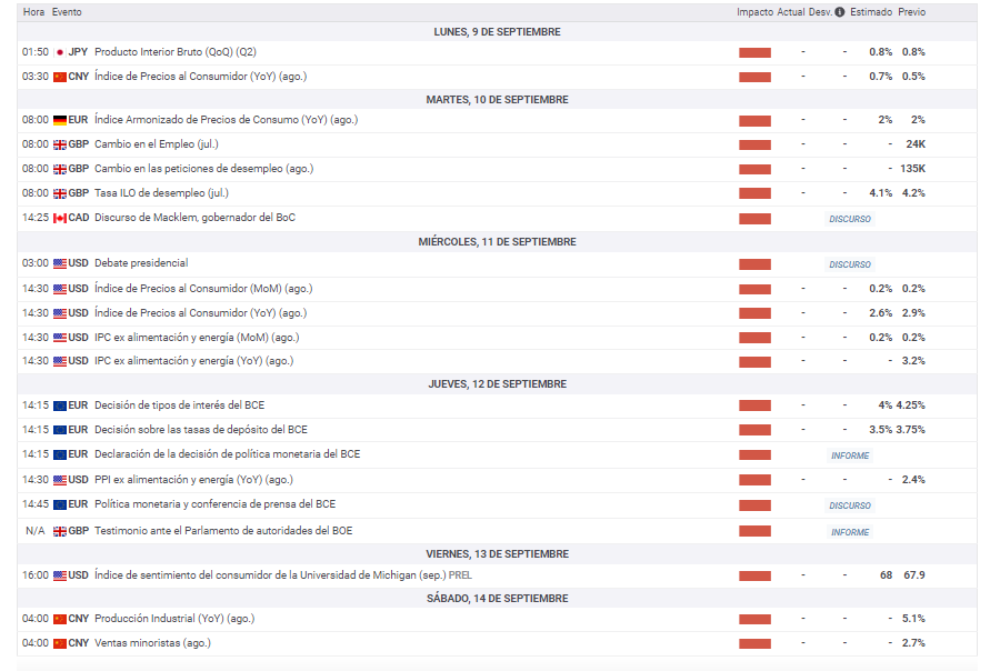 Publicado lunes 9 de septiembre de 2024, a las 00 h UTC. Las horas del Calendario Económico, son UTC+2.