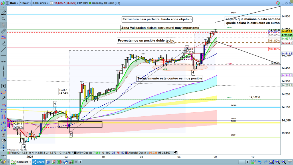 El viernes quedó un escenario, de los que solo se ven muy de vez en cuando, cada x años, los que estuvierais de vacaciones, aconsejo leer Análisis general del dax 8 enero 2023. porque el asunto no es fácil de explicar en cuatro líneas. Básicamente que estamos en zona clave, muy importante que puede marcar la proyección del precio para los próximos años.