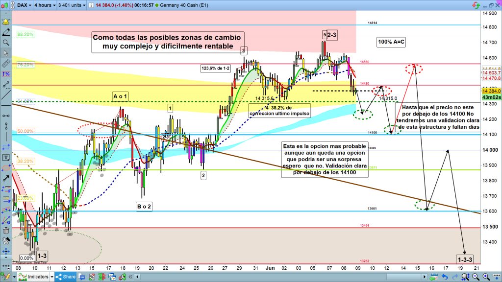 Para hoy, lo más lógico es que siga el movimiento en curso, hasta la zona de los 14260 a 14220. Rebote en corrección de onda 4, por tanto, estructura correctiva desconocida, pauta plana o posible figura, esperemos que no tengamos una estructura compleja, para que no acabe de desaparecer la fuerza actual, esta corrección posiblemente llegue hasta la zona cercana de los 14420. Y a partir de aquí podría empezar un rally hasta la zona de los 14100, para acabar con la primera estructura de 5 ondas, de impulso bajista. Muchísima suerte y muy buenos trades.