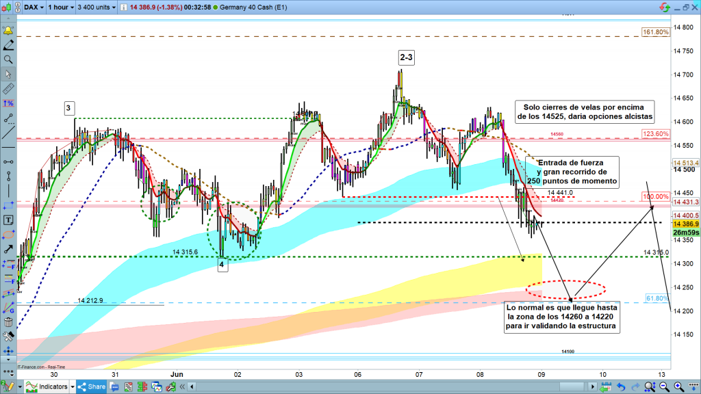 Ayer, planteaba 3 posibles escenarios, dos alcistas y uno bajista, con cierta lógica según lo ocurrido los últimos días de operativa, ya desde el pequeño y atípico recorrido de onda 3, en los últimos días de mayo. no era descartable este escenario. Justo en preapertura a las 8 h, el precio estaba en 14617, la vela de las 9 h rompió con claridad la zona de corrección con cambio de secuencia a bajista. Pese a las buenas noticias con la publicación del dato macro de las 11 h, muy por encima del consenso, ya descontado, siguió cayendo, apoyado con claridad técnicamente, solo hay que ver la diferencia con la zona de corrección para entender la fuerza con la que caía.