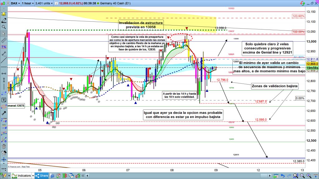 Técnicamente en el día de hoy, por debajo de los 12881, después del cambio de secuencia de máximos y mínimos más altos a mínimo más bajo, a la que el precio encuentre un apoyo, deberíamos seguir en impulso bajista, dirección a la zona de primer objetivo 12411 a 12370. Como siempre esperemos que en sesión asiática y las velas de preapertura y apertura del parquet, nos marquen el camino con claridad.