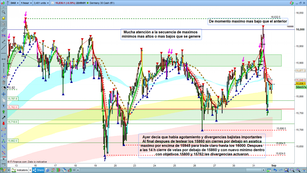 Ayer planteaba agotamiento y divergencias importantes que hacían suponer posible rebote y rally bajista de entrada. La clave estuvo en la sesión asiática donde hubo ataque a la zona del 15860, sin cierres de velas por debajo de dicha cota. Por tanto al no haber confirmación de cambio de tendencia siguió con el impulso del lunes rompió la zona de resistencia de 15890 a 15925, llego hasta el último máximo en la zona del 15945, y en el momento que hizo nuevo máximo, tal como explicaba ayer el movimiento hasta 16000 era muy probable. Ayer también planteaba que si teníamos nuevo máximo por encima de 16032, el movimiento podría ir hasta los 16110 a 16150, sin embargo lo que comentaba de agotamiento y divergencias importantes fue lo que hizo que al testear 16000 caída con fuerza hasta los 15860, cierre de vela por debajo a las 14 h. y en el momento de nuevo mínimo hasta objetivos esperados, ya solo dos desapareció con la subida en 15845, de la 1ª cinta que ya se había situado en la zona del 15860, y por tanto objetivos en 15800, y 15762. Muy buen día de operativa para Intradia 15945 a 16000, de 15859 a 50% 15800 y otro 50% 16762. Para el día de hoy la previsión de los posibles movimientos, es un poco más complicada, Es muy importante la secuencia de máximos y mínimos o más altos o más bajos que se dibuje a partir de hoy, de momento el último máximo ha sido menor que el máximo histórico, y caída marcada por las divergencias fuerte y rápida de 140 puntos. Zonas importantes a vigilar los 15760 a 15730, mientras no los pierda de forma clara, el precio podría seguir en rango como las últimas semanas desde el 13 de agosto. si pierde los 15730, zonas de validación bajista 15698, 15654 y 15624, solo con un mínimo debajo de esta última cota los 15624 tendríamos un posible rally bajista más importante con continuidad fruto de las divergencias ayer comentadas, hasta la zona como primer objetivo de los 15470. Solo después de validación recordar que se puede quedar en rango entre 15730-15760 a 15890-15925. En el caso que sin realizar nuevo mínimo el precio subiera por encima de los 16032, (máximo histórico) el siguiente objetivo como ayer sigue siendo la zona 16110 a 16150. Muchísima suerte y muy buenos trades.