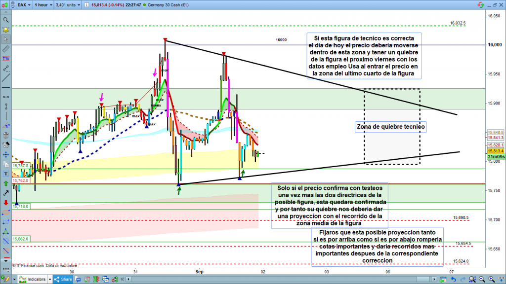 En el caso de que en sesión asiática o en sesión europea de hoy jueves, se invalidara la formación de la figura técnica, muy posiblemente seguiremos en la zona de rango antes comentada, y solo tener especial atención a las cotas dibujadas, recorridos importantes por arriba, con un nuevo máximo por encima de 16032, objetivo la zona 16110 a 16150. Y en el caso de que la rotura fuera por abajo con un mínimo por debajo de 15624, objetivo la zona de los 15470.