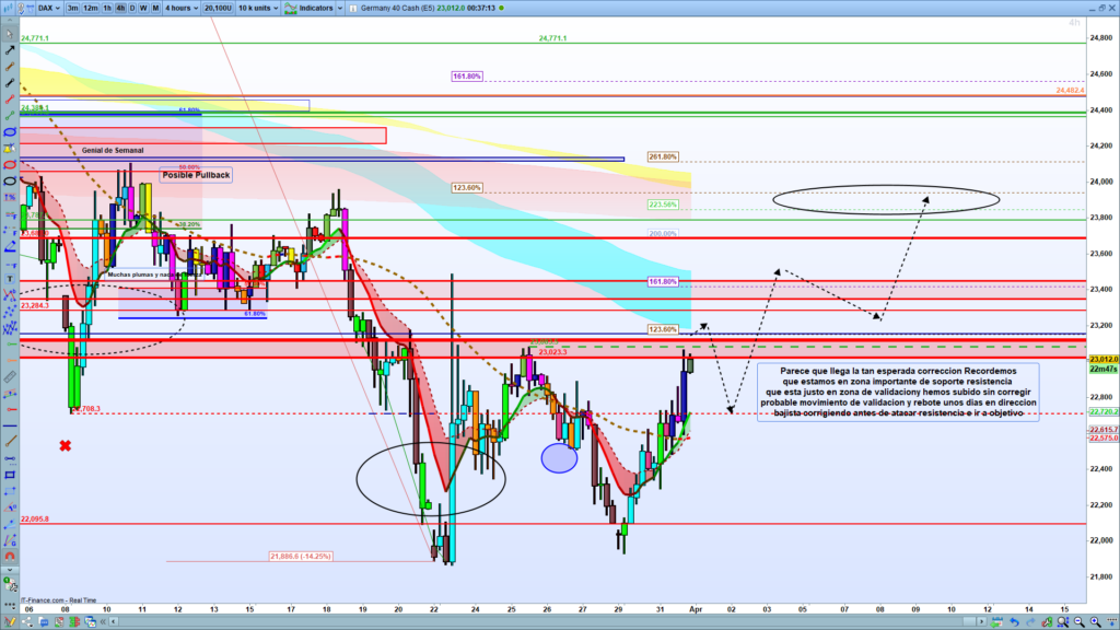 El DAX ha despertado con fuerza rompiendo su letargo bajista, pero la verticalidad del movimiento exige prudencia. El escenario principal trazado nos invita a esperar un retroceso (pullback) hacia la zona de los 22,700 puntos para validar el soporte antes de plantearse nuevas compras agresivas. Con Europa mostrando un claro intento de giro alcista.