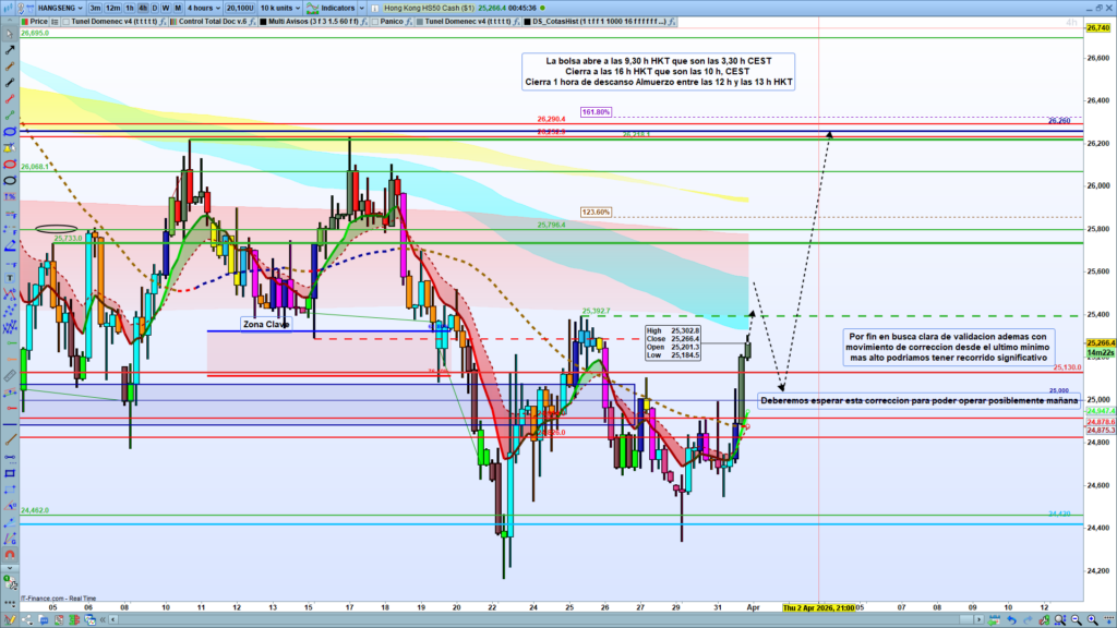 Sincronía Global (Ruptura Alcista): En perfecta sintonía con el despertar del DAX europeo, el mercado asiático también ha roto su letargo. El gráfico muestra un potente impulso alcista continuo (velas verdes) que ha barrido las resistencias previas. Se confirma este cambio de escenario señalando que estamos «Por fin en busca clara de validacion» y destaca la formación de un «ultimo minimo mas alto», un patrón clásico que confirma el giro de la estructura.