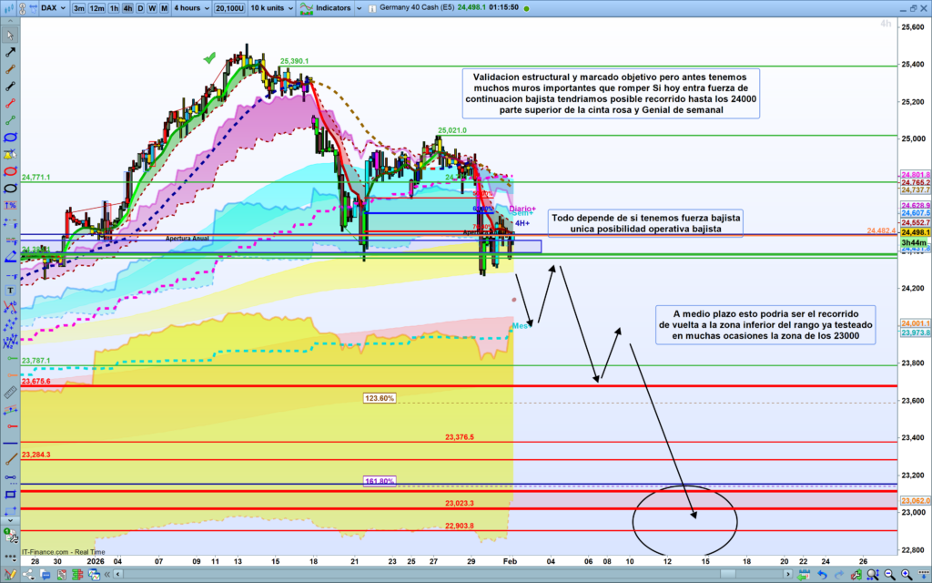 Análisis diario Dax, tipo flash corto, lectura de 2 a 4 minutos, con las claves del día. Ondas de Elliot, estructuras de precio, zonas clave y objetivos.