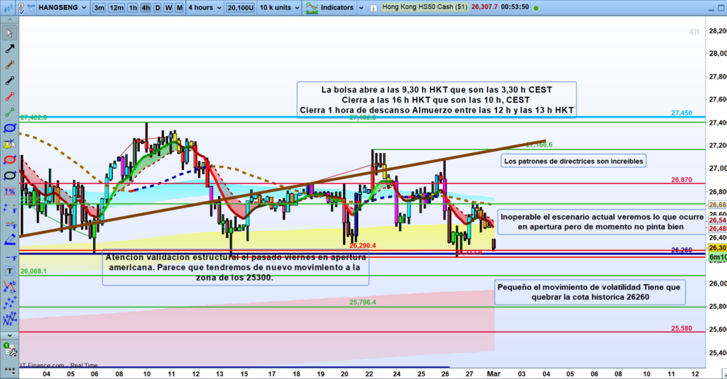 Se mantiene intacta la advertencia de fondo: «Atencion validacion estructural el pasado viernes en apertura americana. Parece que tendremos de nuevo movimiento a la zona de los 25300».