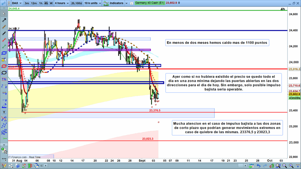 El DAX ha caído más de 1100 puntos en menos de dos meses. Ayer, el precio quedó encerrado en una zona mínima, dejando abiertas las opciones para ambos lados hoy. Sin embargo, la única operativa viable sería un impulso bajista. Es importante vigilar dos zonas de corto plazo clave en caso de impulso bajista, cuyos quiebres en 23,376.5 y 23,023.3 podrían generar movimientos extremos. La perspectiva actual es bajista pero con atención a esos niveles críticos para posibles giros.