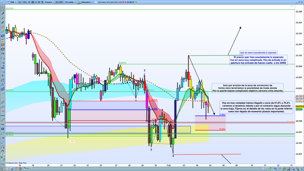 Escenario Alcista: Si en la apertura se produce una «entrada de fuerza», el objetivo sería una vuelta hacia los 24.900. Sin embargo, se aclara que para un «trade alcista» sólido, el precio debe estar «solo por encima de la zona de corrección de forma clara».