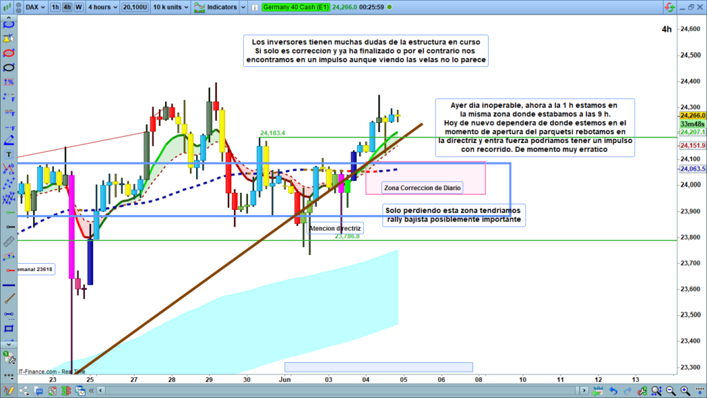 Análisis diario Dax, tipo flash corto, lectura de 2 a 4 minutos, con las claves del día. Ondas de Elliot, estructuras de precio, zonas clave y objetivos.