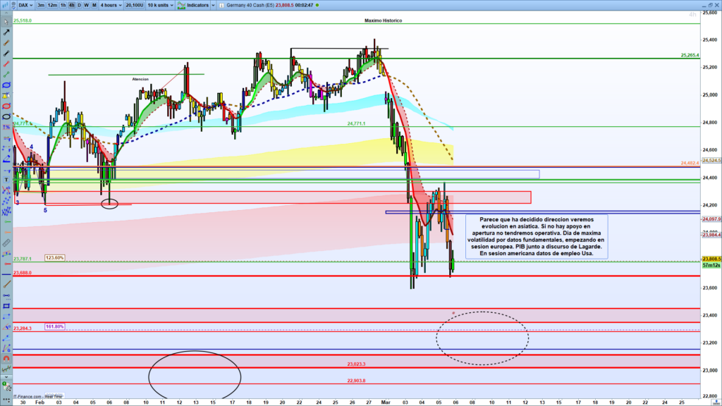 Análisis diario Dax, tipo flash corto, lectura de 2 a 4 minutos, con las claves del día. Ondas de Elliot, estructuras de precio, zonas clave y objetivos.