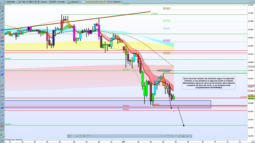 Situación General: Se confirma que el comportamiento del precio va «de momento segun lo esperado». La atención está puesta en comprobar si durante la sesión de hoy «tenemos la segunda parte ya trazada», se marca un nuevo hundimiento hacia la zona de los 24900 – 24800.
