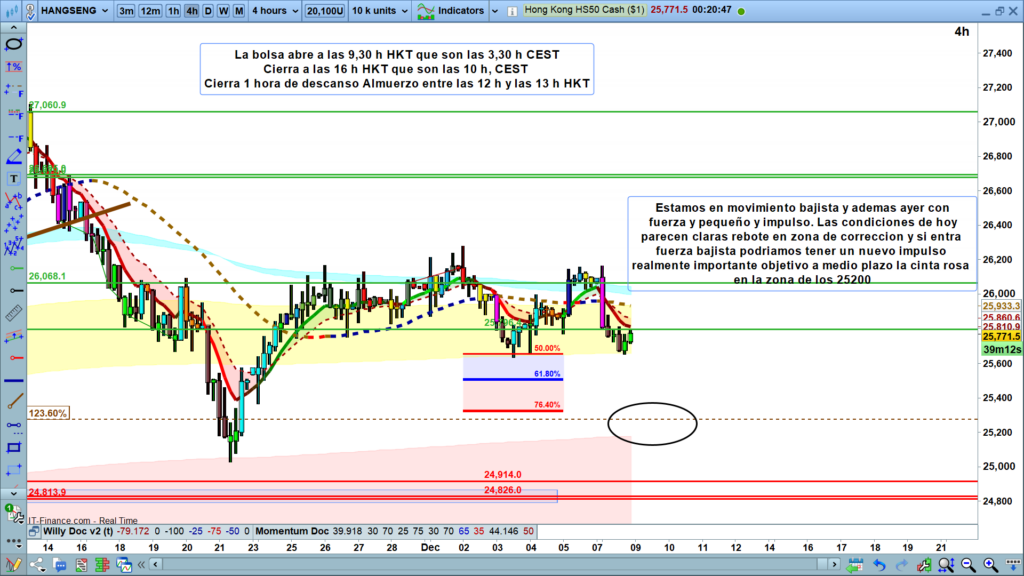 El Escenario Ideal: Si en la apertura «volvemos a estar en la zona de corrección» (posible rebote y a niveles inferiores, aproximadamente25300 a 25200)