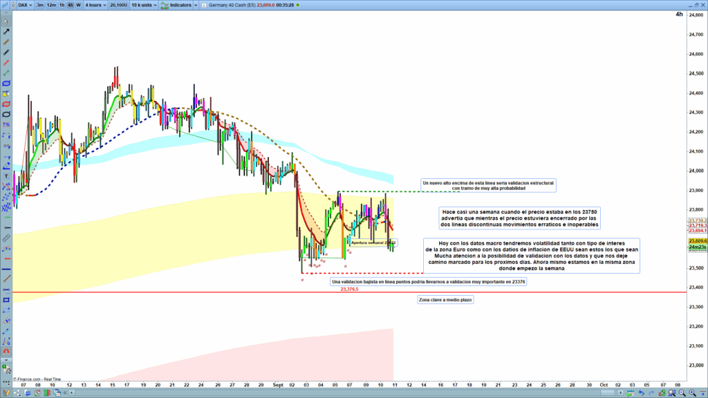 Un nuevo cierre por encima de la línea superior del rango supondría una validación estructural alcista y podría liberar un tramo de alta probabilidad de continuidad. Por el contrario, una ruptura confirmada y cierre por debajo del nivel 23,376.5 supondría validación bajista y marcaría el rumbo hacia niveles inferiores, con importancia de zona clave a medio plazo. En resumen, hasta que no se valide una ruptura clara, el DAX seguirá en rango y la operativa será limitada, con foco en la reacción a los datos macro que puedan definir el nuevo ciclo.