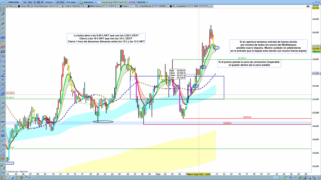 El índice muestra una tendencia alcista clara en el corto plazo, cotizando actualmente en ~25,950 tras superar la resistencia clave en 25,796.4. El precio está por encima de la zona de corrección inoperable (25,000–25,200), lo que refuerza el sesgo alcista, pero hay advertencias de alta volatilidad y posible reversión si no se mantiene este nivel. La próxima resistencia importante está cerca de 26,000, mientras que perder el soporte en 25,900 podría llevarlo a la «zona maldita» (~25,900-25500).