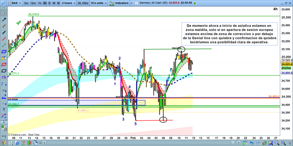 Análisis diario Dax, tipo flash corto, lectura de 2 a 4 minutos, con las claves del día. Ondas de Elliot, estructuras de precio, zonas clave y objetivos.