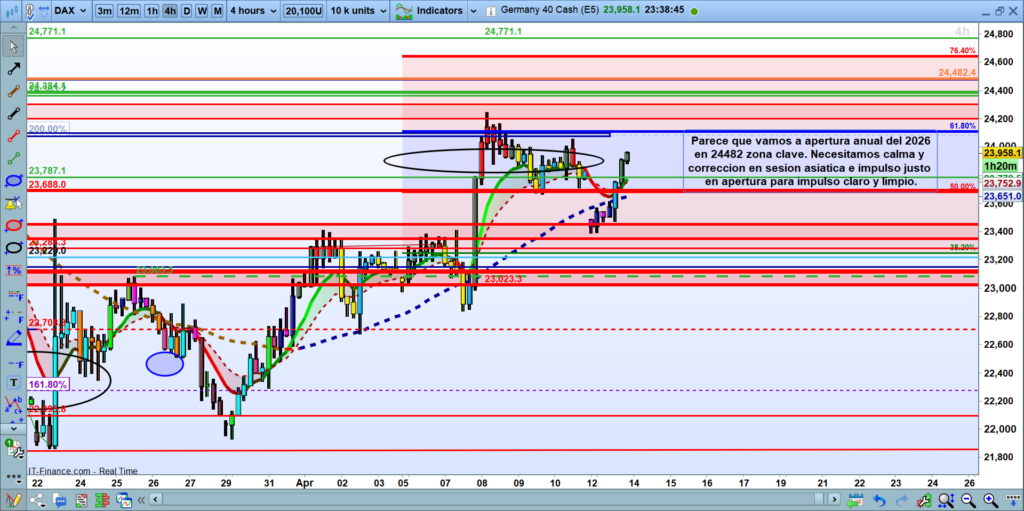 El DAX dibuja hoy un escenario técnico muy atractivo y estructurado apuntando hacia esos 24,482 puntos. Sin embargo, delega toda la responsabilidad del timing a las próximas horas: exige que Asia mantenga la estructura intacta y que Europa entre con fuerza compradora desde el primer minuto. Sabiendo que el éxito de este plan europeo depende de esa «calma y corrección» nocturna.