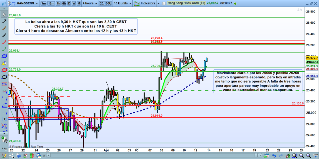El Hang Seng exhibe una fuerza alcista notable hacia esos 26,000 puntos, pero nos deja fuera de juego a nivel operativo. Al no haber realizado esa ansiada «calma y corrección» que sí buscábamos en el DAX, entrar en compra ahora mismo en Asia implicaría perseguir el precio, lo cual rompe las reglas de disciplina. Toca quedarse mirando desde la barrera en esta sesión intradía.