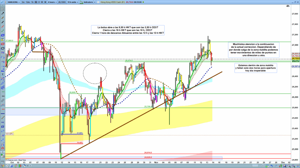 En este momento, nos acercamos a un importante soporte de corto plazo (la «cinta amarilla»). Mi foco estará en la apertura. Si, como parece, abrimos en esta misma zona de indecisión, la operativa será de alto riesgo hasta que no veamos una reacción clara en dicho soporte.