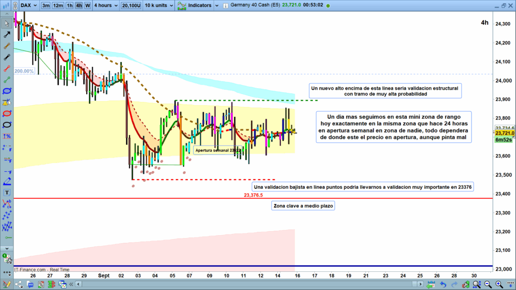 Análisis diario Dax, tipo flash corto, lectura de 2 a 4 minutos, con las claves del día. Ondas de Elliot, estructuras de precio, zonas clave y objetivos.